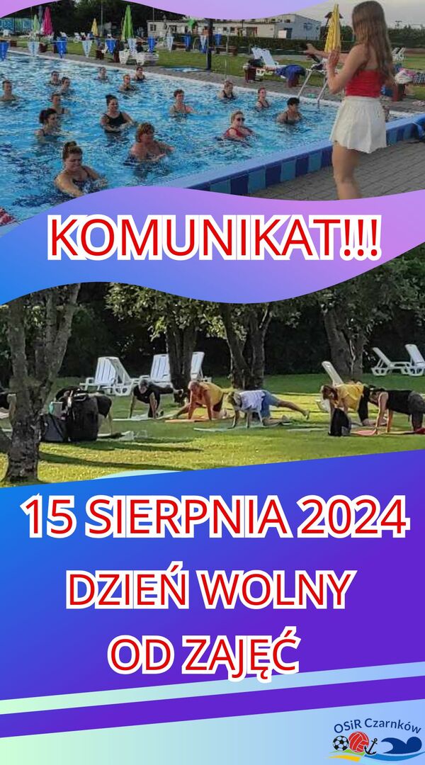 Miłośników zajęć sportowych na terenie kompleksu basenowego informujemy, iż jutro ze względu na ŚWIĘTO nie ma ćwiczeń na trawie i wodzie.