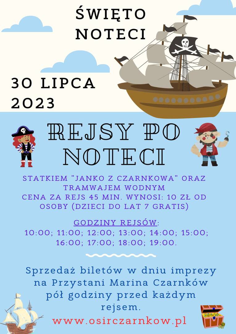 Rejsy po Noteci: dorosli i dzieci powyżej 7 roku zycia 10 zł, dzieci do lat 7 bezpłatnie.